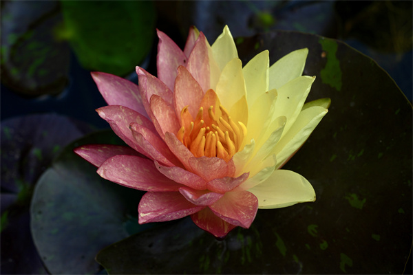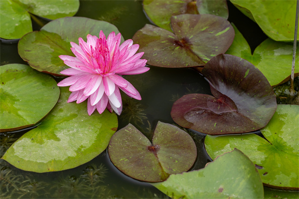 “粉色黎明”也曾获得IWGS最佳耐寒睡莲品种的称号。“粉色黎明”则是粉白两色随机配色 ,花瓣略带斑点,姿态舒展,在一池的波光潋滟中显得娇俏动人。其中一朵“粉色黎明”粉白两色平分花瓣,花色泾渭分明,宛若“水上佳人”清新灵动。