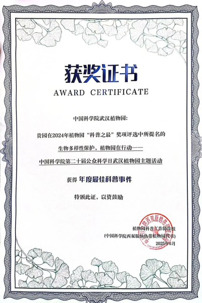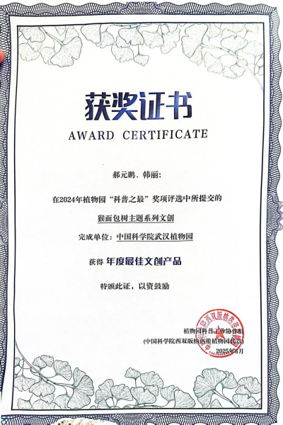 近日,植物园科普工作协作组主办的2024年植物园“科普之最”评奖活动揭晓。活动旨在评选行业先进科普作品,以实践提升科普能力、锻炼队伍,发挥示范作用。经初评、复评,共评出10项具有广泛影响或行业先进性的科普产出,以及7家植物园的特色科普事件。中国科学院武汉植物园荣获“年度最佳科普事件”和“最佳文创产品奖”两项大奖。