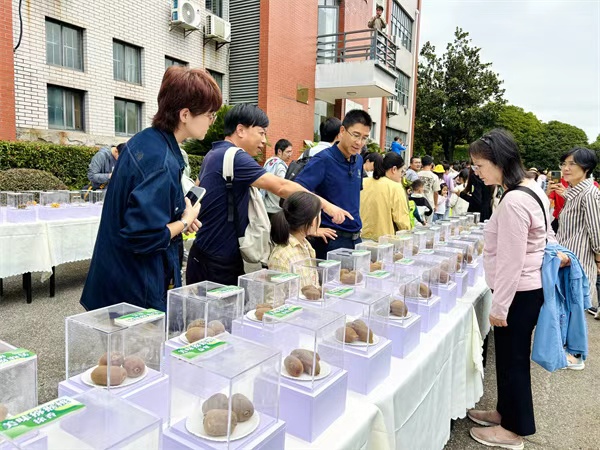 在国家猕猴桃种质资源圃外,一场更直观的猕猴桃果实科普展示吸引了不少公众的目光。60种猕猴桃果实在桌子上依次整齐排列,维生素C含量很高的阔叶猕猴桃,长着尖尖“嘴巴”的对萼猕猴桃,身披白毛的毛花猕猴桃,味道麻辣的大籽猕猴桃,个头似小枣的软枣猕猴桃,耐贮性极佳的黄肉品种‘金艳’,酸、甜、苦、辣、麻风味应有尽有,绿色、黄色、橘色颜色各异,猕猴桃的果实多样性,让公众大开眼界。