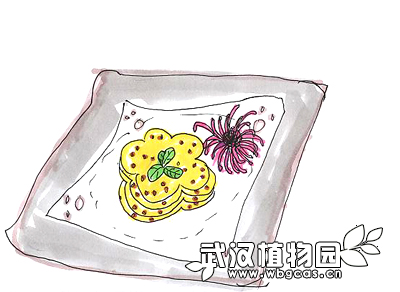 菊花糕:把菊花拌在米浆里,蒸制成糕,或用绿豆粉与菊花制糕,具有清凉去火的食疗效果。