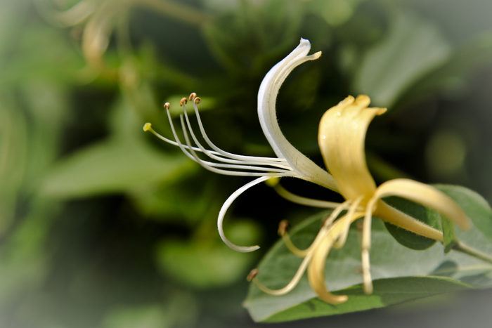 金银花是有色有香的藤本植物,它的叶是对生的,花儿也是成对的生于叶腋间,像一对永不分离的恋人,有人便给它起了个有浪漫色彩的名字“鸳鸯藤”。通常白色的花卉香味特别,或浓郁,或清冽,盛开时总会给人一种别样的思绪,金银花亦然。初开时香味清冽,翌日花色变黄,香气也逐渐散失。金银花久服可轻身长寿,李时珍在《本草纲目》中对此作了明确定论。清朝《御香飘渺录》一书中还记载了慈禧用金银花洗面保养肌肤、养颜美容的事实。