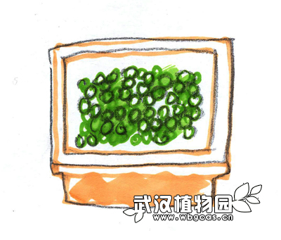 4.盖上纱布后先用水浇透直到花盆底部流出水为止,如果你是在办公室里就更好了,趁你休息的时候就可以给它浇水,为了防止水流到地上,可以在花盆下面放个托盘;一天里至少给它淋水四次,特别要记得下班前再淋上水。记住水是浇在纱布上的,所以即使你有时忘了浇水,纱布还是湿润的话也不要紧,如果你尝试长时间忘记浇水,到后来纱布也干了,那么绿豆脱水了就不会发芽了。