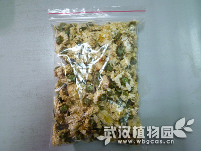 6、再倒菊花,小火炒,用手背翻炒菊花,将菊花炒至没水分。