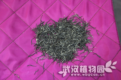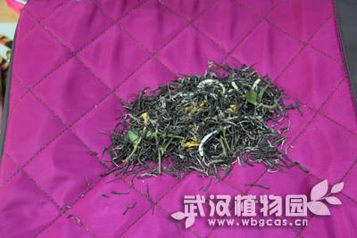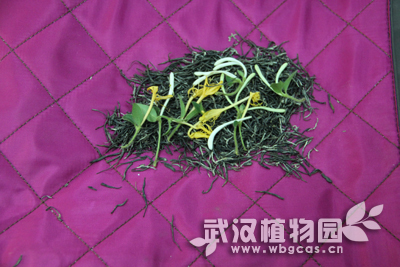金银花茶以精制绿茶胚为主料,用量为90%左右。按照“高温刹青、快速搓揉、完全烘烤”的绿茶制作新工艺制成茶胚,要求茶条紧结、叶片幼嫩、含水量低于5%,并剔除老叶、茶梗杂物、筛去茶末。