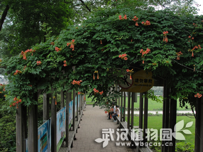 入夏后,凌霄绿色的枝叶中点缀着朵朵火红的花儿,其屹立于枝头,开得热烈奔放,十分美丽耀眼。凌霄可用于假山、花廊、棚架、墙垣绿化,是理想的垂直绿化、美化花木品种。