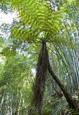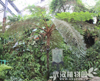 武汉植物园景观温室的瀑布前面有一棵身形优美的笔筒树,可它常常被误认为是桫椤。