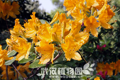 落叶杜鹃羊踟躅,是一种落叶灌木,高约1.5米,花呈金黄色,或桔黄,数朵簇生,喉部缀淡绿色色点群,使花朵显得分外俏丽,生于海拔1000m的坡草地或丘陵地带的灌木丛及山脊杂木林下。