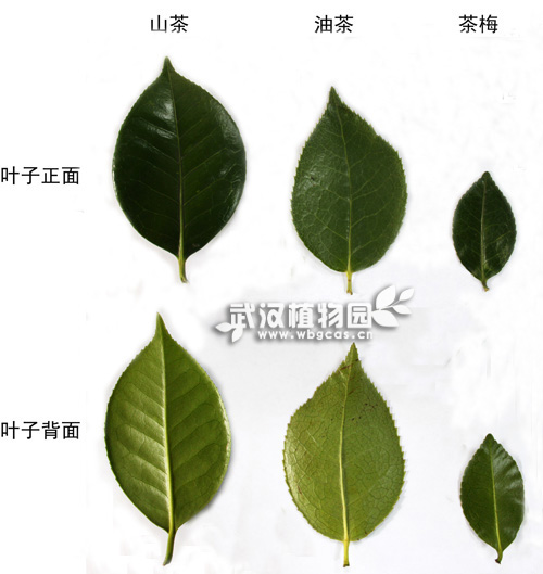 茶和油茶的叶片较大,长度都在5厘米以上;而且山茶叶片比油茶的更长一些。二是叶色不同:山茶和油茶叶片颜色较浅,茶梅叶片颜色较深。三是叶脉明显程度不同:茶梅网状叶脉不明显;山茶较茶梅明显,但两者网状脉基本不突出;油茶网状叶脉较前两者明显,并且背面的脉络明显突出。四是叶缘锯齿锋利程度不同:油茶叶缘锯齿比较锋利,触摸有扎手的感觉;而山茶和茶梅叶缘锯齿较为圆滑,触摸不感到扎手。