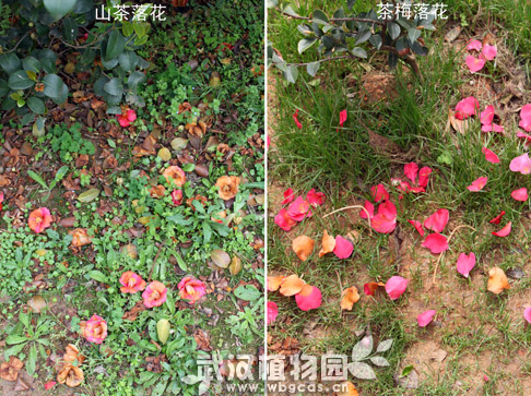 此外落花的形态也有差别。山茶花是整朵地凋落;而茶梅花是一片片地散落;油茶花落花形态介于二者之间,有的花整朵凋落,有的花则片片散落。
