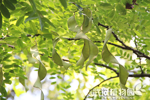 步入武汉植物园的珍稀植物区,可以看到长果秤锤树的旁边,生长着几棵皂荚,这个季节树上正挂满了果实。