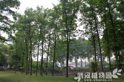 武汉植物园大草坪的周围有几棵喜树(Camptotheca acuminata),它的果实落地像莲花,又被叫做“旱莲木”,是我国特产的并且分布比较广泛的珍贵树种。