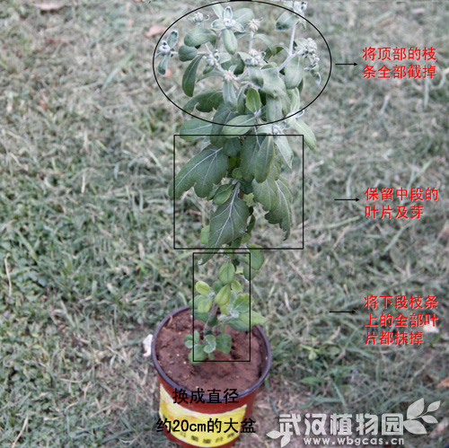 如何挽救这盆菊苗呢?“花博士”建议要尽快换盆,换到直径约20厘米的盆子中去,并且打上底肥。此外,把植株上段截去,植株下段的叶子及芽都抹去,保留植株中间部分的叶子及芽,这样植株可以从中部发出新枝来(图3)。同时,还要定期施肥哟。