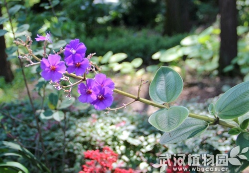 盛夏7月,武汉植物园药园里的银毛野牡丹热烈开放了。朵朵小花并不张扬,但却很有魅力,它们拥有着比较少见的艳丽紫色,在阳光的照射下熠熠生辉,十分引人注目。