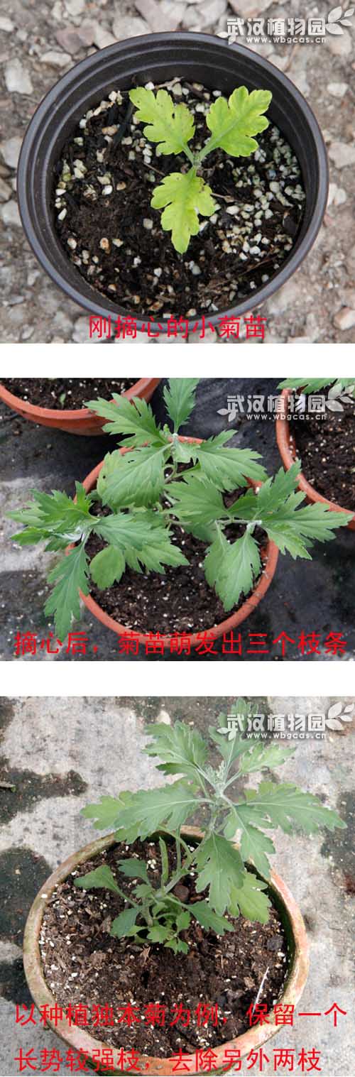图中是独本菊疏枝的过程,随着菊苗的成熟,还要及时的剥芽除蕾