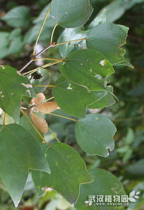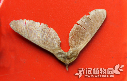 我们来看看这些植物的“飞行设备”,有的是翅膀或翅膜,比如枫杨、铜钱树;有的是针芒,比如南荻、芒草;有的是羽毛或绒毛,比如蒲公英、柳树。而三角枫的果实有一对翅膀,长在种子的两边。下落时,在一对翅膀的作用下,果实会旋转向下。三角枫的果实较重,不像蒲公英、杨柳类非常轻柔,可以随风飘得很远,但其两翼的翅膀也扩大了果实的风阻,在有风的情况下,可飘向更远的地方。在一般风力的情况下,这个距离并不远,根据本园的观察,这个距离不超过100米;但在极其猛烈的风力条件下,相信可以传播非常远的距离。