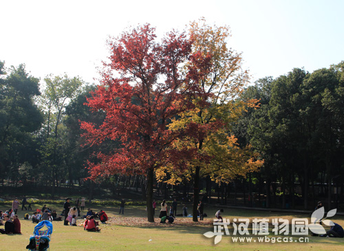 植物园的中心草坪长有两颗枫香。因为草坪很开阔,枫香树的附近没有其它树木,所以这两棵枫香树容易引起关注。而在霜叶红于二月花的秋季,这两棵树更加引人注意。一方面是因为红彤彤的叶片,另一方面是因为红彤彤的叶片只有一棵树有,而另一棵还是保持绿色,像法国梧桐一样,再慢慢变黄飘落。