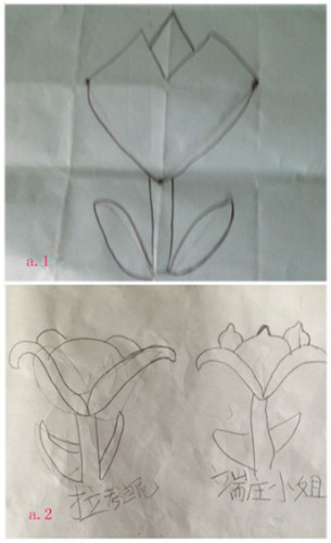 在4月12日(周六)上午举行的课堂“绘画与郁金香”,是武汉植物园举行“会员科普课堂”中的一期。2014年全年共有18期,主要针对6-10岁孩子群体。这期课堂的目的是让孩子们了解郁金香的知识,观察郁金香的结构,并通过绘画加深对郁金香的认识。其中,绘画在两个区域进行:一是在教室里。孩子们听老师讲解后,在其引导下作画;二是在植物园的郁金香展区。实地观察,看着实物郁金香作画。这样每个孩子至少都有两幅作品。以下图1和图2是两位小朋友a和b的作品(我们暂且用a和b代替)。