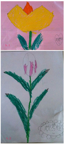 首先,我们先看小朋友a的作品。图a.1是教室内的作品,根据老师的讲述和幻灯片的图片进行创作。图a.2是户外的作品,比照着真实的郁金香画的。可以看出,教室内的作品单调,花瓣和叶片的处理都很简单,整体呈现一种普通、没有个性的感觉。而同一个小朋友户外的作品是另外一种情形。他(她)画了两种不同的花型,注意到了花瓣的卷曲、边缘形状和相对位置,努力展现所看到的花朵的细节。对比两幅作品,对于两者叶片的形状,户外作品更尖锐些,更接近真实情形;另外,教室绘画郁金香茎秆是直立的,而户外的则有些弯曲,我们知道后者更接近真实的情形。我们可以得出结论,通过户外体验,可以让孩子们了解到郁金香更多东西,观察到更多的细节,更有信心展现所学到的东西。
