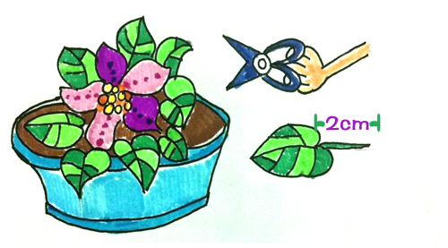 第一个步骤,准备好扦插所需的母本植株,然后取叶,挑选一片肥厚健壮无病虫的老叶进行叶插繁殖,叶柄留2厘米长剪下,稍晾干。非洲堇叶插四季均可。