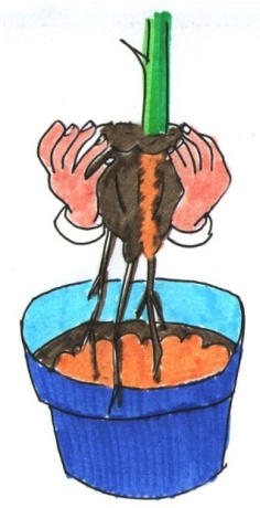 (2)将土坨的旧土去掉一部分,剪去坏跟和老根,重新栽植在比原来大一号的盆中,加上新土并压紧,随后浇水。(见下图)