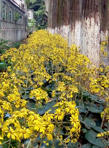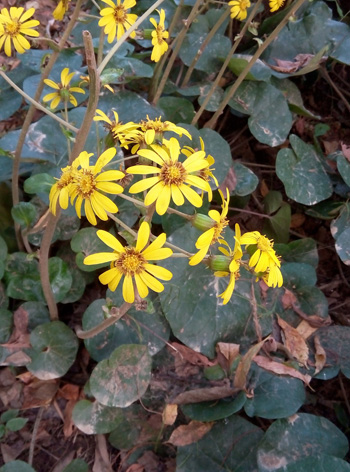范仲淹曾经感慨过“碧云天,黄叶地。秋色连波,波上寒烟翠”。把秋天描绘的那么凄清哀飒,俺觉得那是他没看见俺!秋天正是属于俺的舞台,俺最喜欢迎着瑟瑟秋风,和着细细秋雨,绽放俺傲人的身姿了。当你在暗色调的公园里突然看到一抹惹人眼亮的明黄色,一大片一大片,在绿叶的衬托下更加明晃晃,像许多金黄色的火炬,让你感觉一下子忘记了秋天的萧瑟与枯零,那就是俺——大吴风草!严冬的时候俺把果实包成个蒲公英般的小绒球,一簇簇,俏皮活泼,看起来就让你觉得俺是那冬天里的一件小棉袄。