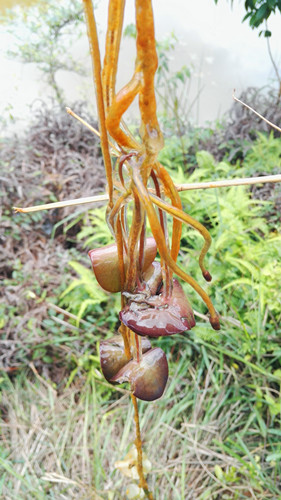 莼菜,又名马蹄草,因形似椭圆形案板,故在四川称“水案板”。多年生浮叶水生草本,隶属于莼菜科莼菜属,自为本属的老大(此属仅一种)。夏初时分,你便会看到武汉植物园入园的水池中铺满一片片钝圆形的绿叶,其间朵朵暗紫色的小花显得格外可爱,当你轻轻提起叶片时,便会发现在其茎及叶背面附着着厚厚的胶质黏液(莼菜多糖),可别小觑它,正是有了它才使得莼菜具有别样的风味。瞧那初发的幼叶和花苞完全被透明的胶质包裹,好像襁褓中的婴孩般,晶莹小巧。曾经莼菜在我国黄河以南地区广泛分布,湖泊、沼泽甚至是农田都是它的温床,可是如今有着“洁癖”(对水质要求极高)的莼菜只在云南、四川、两湖、江浙等地的湖泊、沼泽中零星分布,要知道现在野生莼菜可是国家一级重点保护植物呢!是不是一下子心里一震,顿生疑问:这还让吃吗!?吃货们不要悲伤,在杭州西湖、湖北利川和重庆石柱等地栽培的莼菜足以让你一饱口福!
