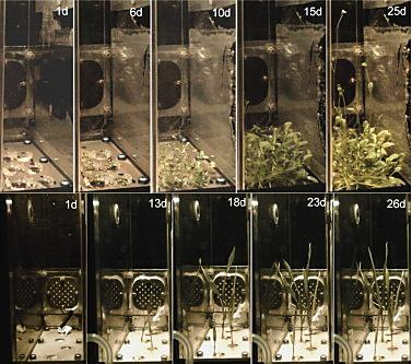 拟南芥(上图)和水稻(下图)在高等植物培养箱中生长的实时可见光图像。图片来源网络