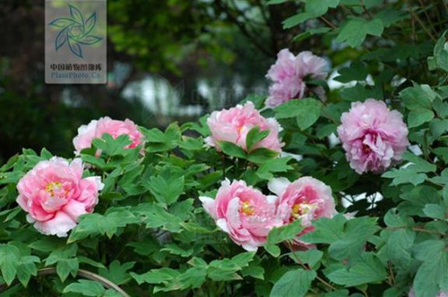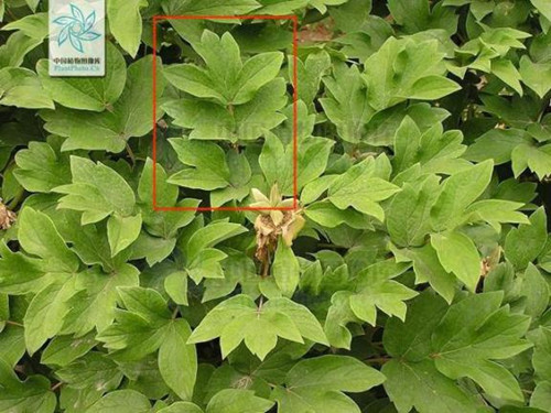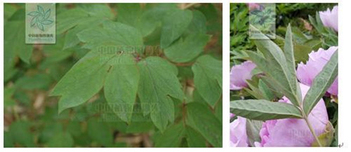 牡丹的叶片常为二回三出复叶,叶轴分枝一次,一个分枝或不分枝的叶轴上着生3枚小叶。