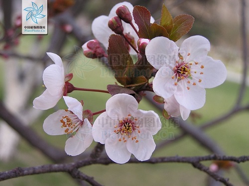 本是樱桃李栽培种的紫叶变种,因其紫色的叶片在一丛绿色中耀眼夺目,现在已成为常见的观赏树种之一。其花朵很容易与樱花混淆,但是紫褐色的新叶是其识别标志,另外,紫叶李也是没有樱花花瓣尖端的缺刻的。
