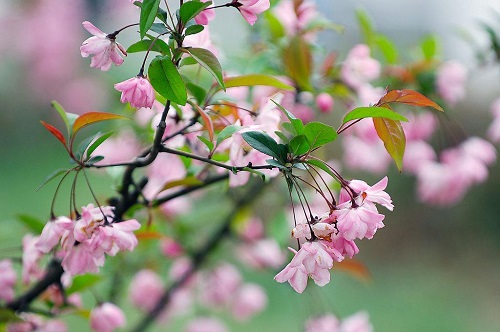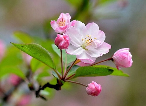 2、西府海棠,《本草纲目》中称之为“海红”,可入药。花瓣也多为粉色,相对于垂丝海棠低垂下的娇羞,西府海棠则以一种仰望天空的姿态傲然绽放。一个如小家碧玉,一个像大家闺秀,你知道怎么区分了吗?