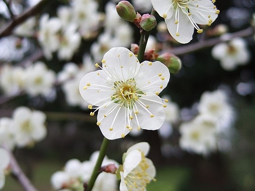 “墙角数枝梅,凌寒独自开”提到梅花,总少不了赞赏它不畏严寒的品性,的确,梅花是这些花中绽放最早的种,从寒冬腊月至来年三月,都少不了梅花疏影横斜的身影。梅花花朵较小,花瓣接近正圆形,没有花柄,先花后叶。与同属的杏花最大的区别是梅花的萼片不会反折,杏花的小枝红褐色,但是梅花小枝绿色。