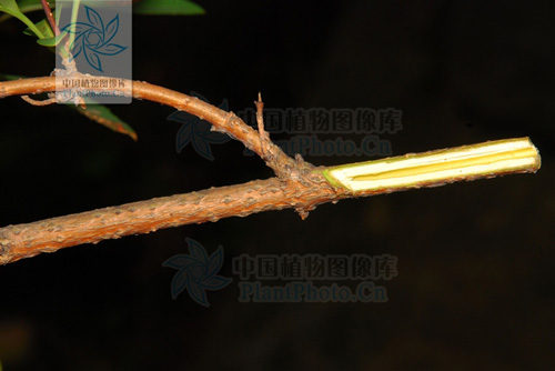 金钟花小枝绿色或黄绿色,呈四棱形,皮孔明显,具片状髓,而连翘小枝土黄色或灰褐色,略呈四棱形,疏生皮孔,节间中空,节部具实心髓。