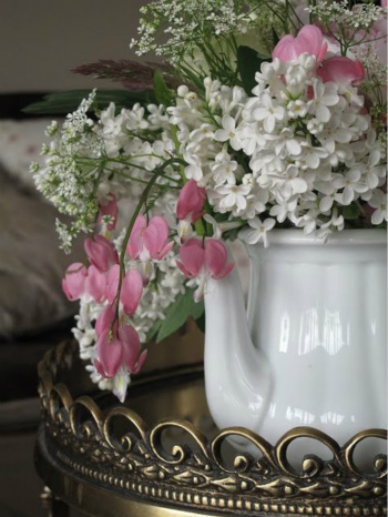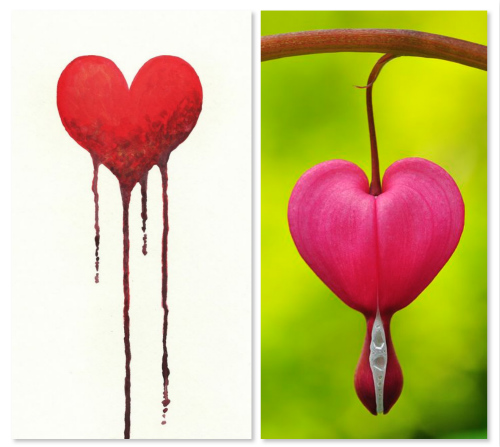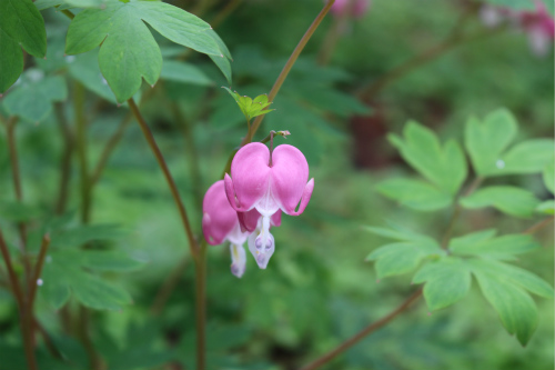 荷包牡丹可以从晚春开花到初夏,花从水平生长的总状花序上垂下来,多为桃红色与白色的复色花,每朵花有四个花瓣,两瓣桃红色的外在花瓣,组成心形的“荷包”,两瓣白色的内在花瓣,包在桃红色外在花瓣里面,尖端下垂突出,就好像从心部滴下的血滴,而有了 “Bleeding Heart” 的英文名。撇开颜色不说,一朵绽放时的荷包牡丹,真的很像一颗流血的心呐!