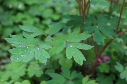 荷包牡丹通常为30-90cm的草本,叶似牡丹,对生,二回三出羽状复叶,缺刻,有基部楔形的倒卵形深裂片,背面还有白色粉末。
