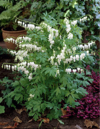 荷包牡丹也不全是桃红色的,还有一些其它颜色的栽培种,如Lamprocapnos spectabilis ’Alba’,花瓣都是白色的。