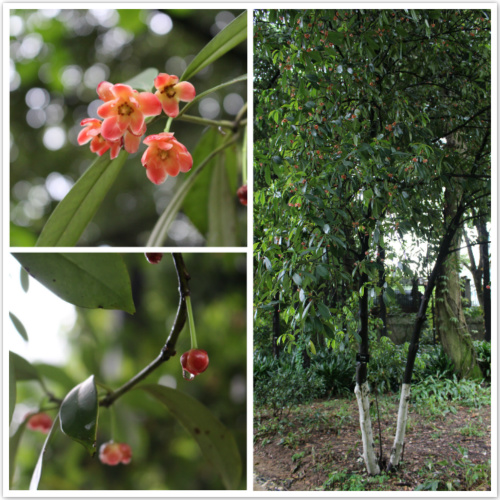 有种植物有着红色肉质小红花,似塑料小花,花未开时如一粒红色小果,树皮灰褐色,叶片革质,中脉在叶片上面下凹,在下面突起,侧脉不明显;叶柄上部还有不明显的狭翅。原来是红茴香,有的地方说红茴香是红毒茴,究竟是不是呢?