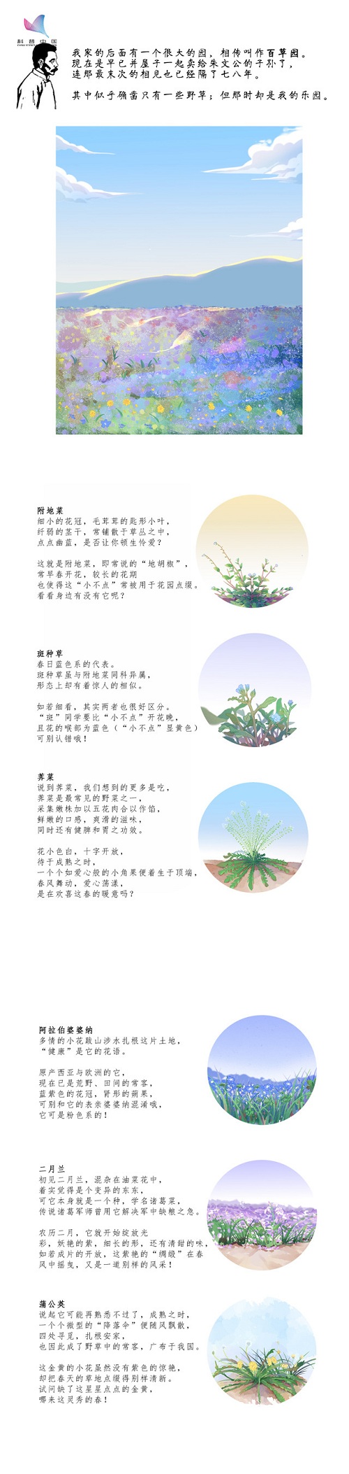 摘要:你还记得语文课本中的《从百草园到三味书屋》吗?神秘的百草园里孕育着数不清的花花草草,花香扑鼻、峰蝶翩翩起舞,还有传说中的“美女蛇”,当然更重要的,是这里充满着鲁迅先生儿时的记忆。今天,就让我们一起走过百草园和三味书屋,搜寻鲁迅先生笔下的一草一木吧。这里有附地菜、斑种草、荠菜、阿拉伯婆婆纳、二月兰、蒲公英……百草园里百草深,百草深处百虫鸣。识得百草园,赏得百花香。