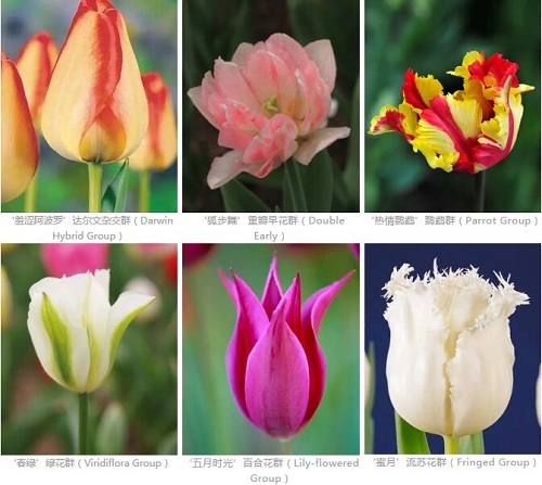 郁金香的花型也非常丰富,1981年,国外将郁金香分为4类15群,包括百合花群(Lily-flowered Group)、流苏花群(Fringed Group,饰边群)、绿花群(Viridi flora Group)、伦勃朗群(Rembrandt Group)、鹦鹉群(Parrot Group)、牡丹花型群 Peony-flowered)等。武汉植物园就展示过流苏花群(Fringed Group,饰边群)、百合花群型(Lily-flowered Group)、鹦鹉群Parrot Group)等多个类群的郁金香。