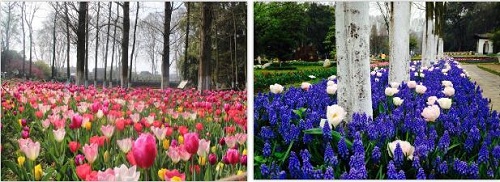 左:早、中、晚花期的郁金香混种 右:郁金香与葡萄风信子的混种