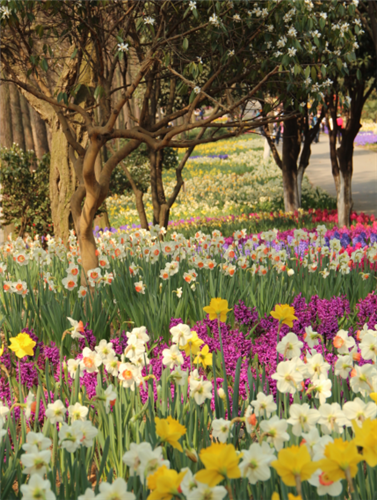 郁金香、洋水仙、风信子、葡萄风信子等各类球根花卉争相开放,构成一幅色彩繁茂的画卷。