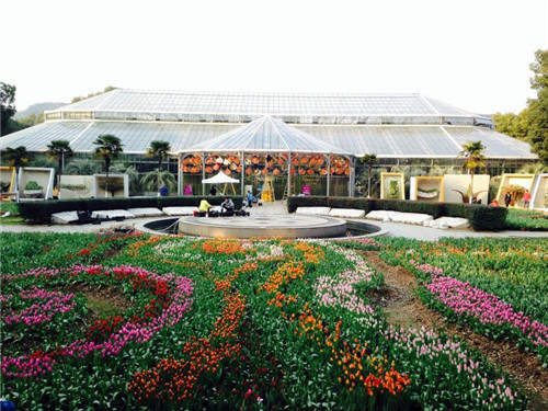 武汉植物园每年展示的郁金香品种有100多个,是华中地区展示郁金香品种最多的地方。今年展示的郁金香的品种达138个,其中‘橙色范伊客’‘鹦鹉王子’等32个新品种首次亮相武汉植物园。红、粉、白、橙、绿、紫、黄、黑等10个色系40多个花色,百合型、牡丹型、杯型、球型、卵型等多姿的花型,让郁金香以一己之力承包了整个春天的五彩斑斓。