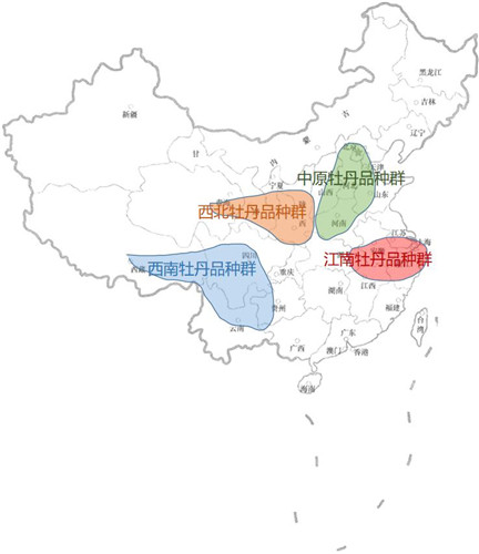 依据种源关系和生态习性等因素不同,牡丹被划分为四大栽培品种群,分别是中原、西北、西南、江南牡丹品种群。