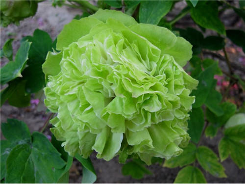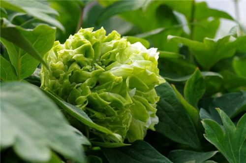 雄蕊充分瓣化,雌蕊也多瓣化,内外瓣形状大小近似,堆叠隆起呈球形,形似绣球花。代表品种,‘豆绿’、‘娇容三变’等。