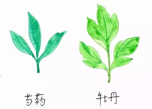 牡丹叶表面绿色,背面浅绿色;芍药叶两面均为翠绿色,有光泽。打个比方,就像工艺制品,牡丹叶为“磨砂面”,芍药叶为“光面”。