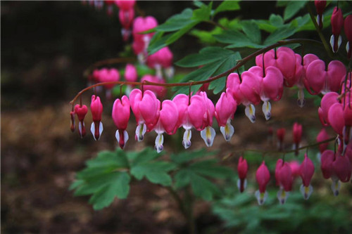 荷包牡丹的花非常特别,许多花朵组成弯垂的总状花序,粉红色的心形花朵,娇小玲珑,下面还缀着一只晶莹剔透的“水滴”。一串串小花挂在枝头,远远望去,错落有致,非常美丽。荷包牡丹还有一个英文名叫“bleeding heart”(滴血的心),也是因为其形似心脏。