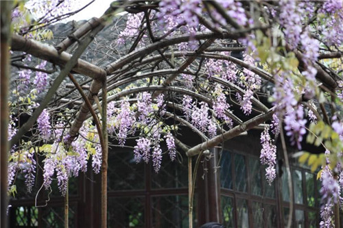 每到4月中旬,郁金香、风信子、桃花等纷纷暂别“花坛”后,中国科学院武汉植物园里景观温室后的廊架上,一大片紫色的紫藤便花开繁盛的闪亮登场。
