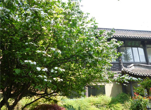琼花也可植于坡地、水边、建筑旁及与园林小品相结合。如扬州琼花观、大月寺等地的琼花景色,或与水相映成趣,或与塔遥遥相望,大家不仅可以赏美景,还能听趣闻,绝对让人回味无穷、流连忘返。