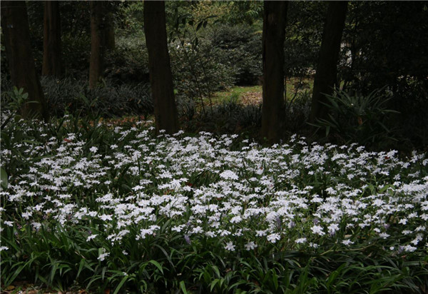 蝴蝶花鸢尾属众多植物中最常见的花卉之一,很多城市的公园和绿地多有栽培。因它扁圆形的根状茎一节一节的像竹根,又被称为扁竹根。白色的花瓣有两轮,外轮的三瓣花肥大,淡紫色斑点点缀在橙黄色条带(鸡冠状附属物)的周围,很像蝴蝶翅膀上的花纹,边缘有小细齿;内轮的三瓣花较瘦;在这一肥一瘦的重叠中是流苏状的花柱。蝴蝶花盛开时,轻风拂过,远远望去,犹如在花丛中翩翩起舞的蝴蝶。
