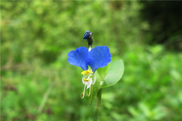 鸭跖草,常生长在河岸、湖畔、溪流旁的湿地。鸭跖草茎叶似竹,两枚蓝色佛焰苞状的总苞片舒展上扬,仿佛扑棱着翅膀将要飞离绿枝的蝴蝶,仔细观察会发现下面悄悄藏着两枚膜质萼片。曾有诗云:“扬葩蔌蔌傍疏篱,翅薄舒青势欲飞。几误佳人将扇扑,始知错认枉心机。”,足见古人对他的情真意切。鸭跖草不但花色清丽雅致可供观赏,它的花边也大有用处。它的花瓣中含有的鸭跖蓝素可作染料,在明朝时,用鸭跖草染色的彩羊皮灯就非常受大众欢迎。如今江南亦有艺人,用鸭跖草花的汁液来染亚麻布,大有一番古今文明智慧的对话之感。。