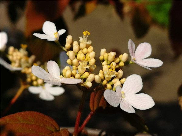 琼花之名自宋代有之,宋代王禹偁[chēng]《后土庙琼花诗》序:“扬州后土庙有花一株,洁白可爱,且其树大而花繁,不知实何木也,俗谓之琼花。因赋诗以状其态。”其花型奇特,聚伞花序集生成伞房状花序,中央为两性可孕花,边缘为大型白色不孕花,常为八朵,故又称聚八仙或八仙花。琼花花开四月,洁白轻盈,微风拂过,宛如群蝶蹁跹起舞。